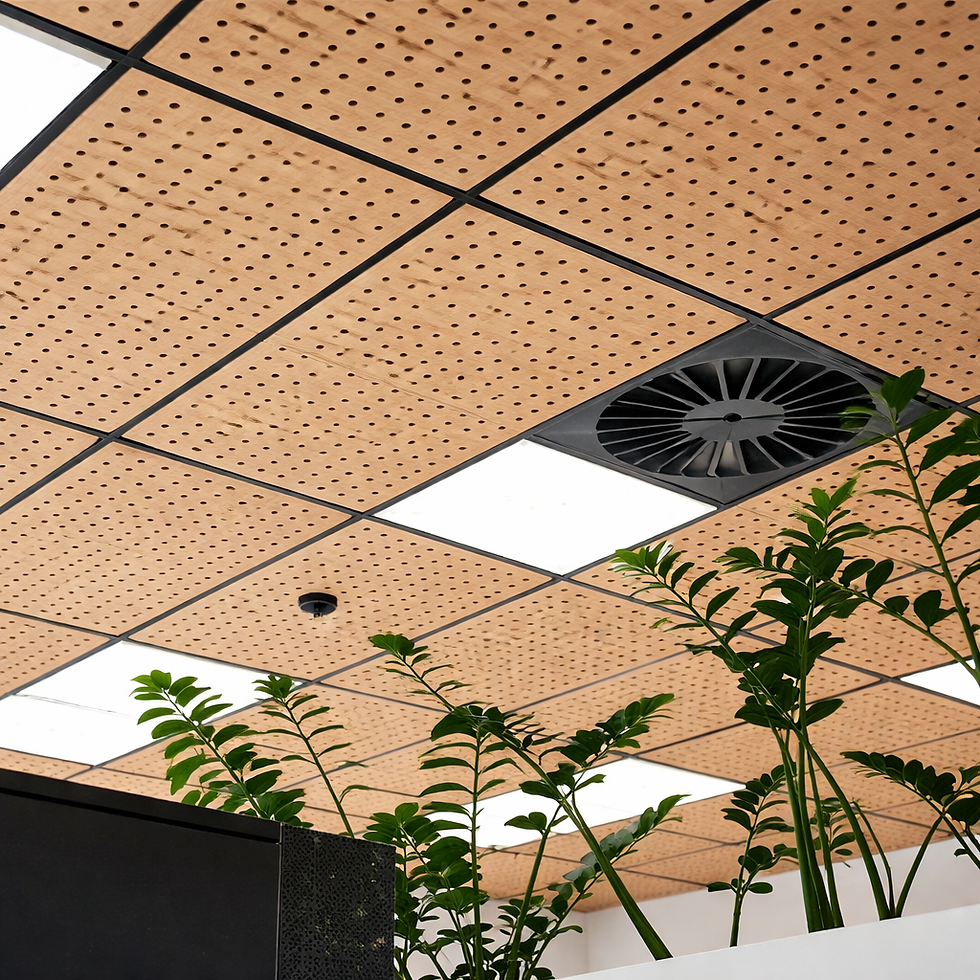 WoodWorks Timber Acoustic Suspended Ceilings. A range of acoustic timber ceiling and wall panels that help to fulfil our human need to connect with nature whilst spending indoors. FSC Certified timber acoustic ceiling tiles / panels and planks. Available a variety of sizes, edge details, perforations and finishes.