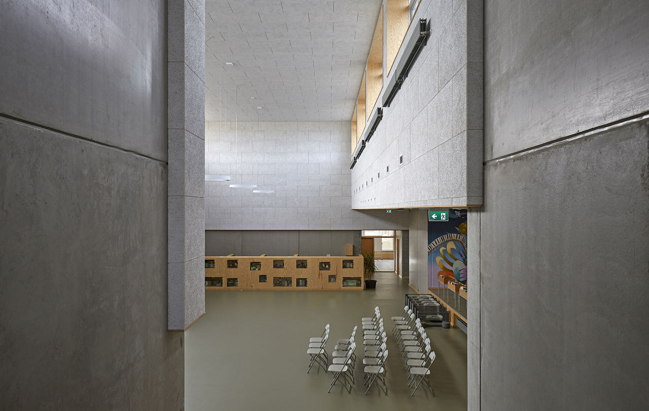 The new school centre is a group of structures with the centre building as the highest. This is the heart of the complex and where pulsating life is found all the time. Inside, materials such as concrete, veneer, coloured linoleum floors and white-painted Troldtekt acoustic ceilings help to create a bright and friendly environment.