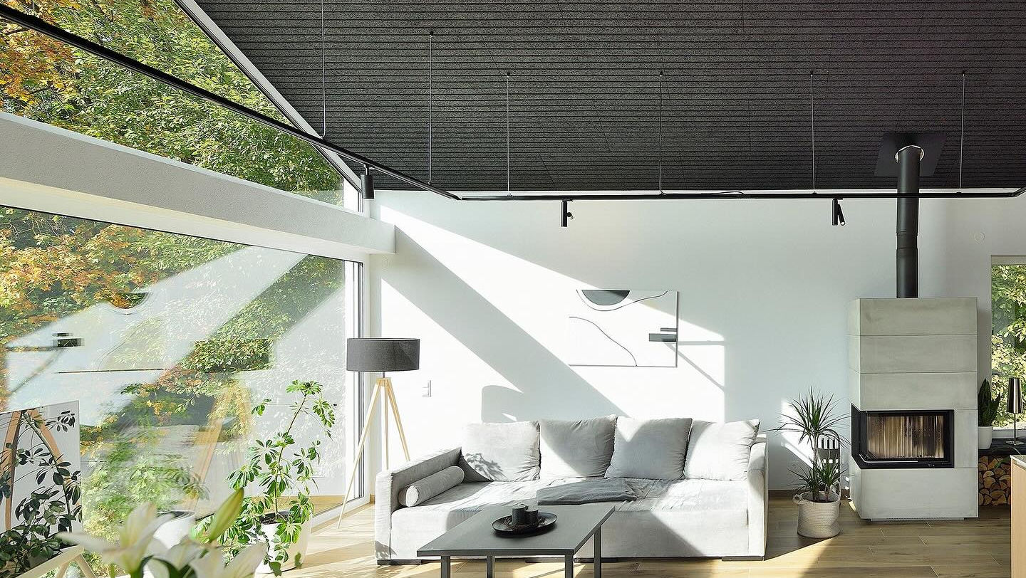 Acting as a strong design accent, black Troldtekt v-line panels have been installed on the two sloping roofs, divided by the visible ridge. The decorative milled grooves define the character of the ceiling areas and give the room its unique charm while ensuring good acoustics